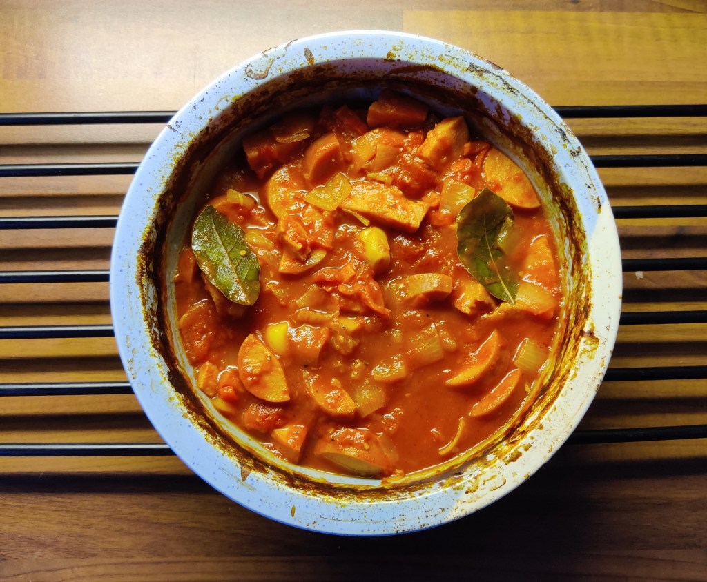 Joten ei kun uuni lämpenemään, muistaakseni 175 astetta, ja raaka-aineiden etsintään. Kaappien syövereistä löytyi paketillinen grillimakkaraa, purkillinen kokonaisia säilyketomaatteja, sipulia, valkosipulia sekä chiliä. Ensin pataan purkkitomaatit ja pieni määrä nestettä, tässä tapauksessa hanavettä. Perään pilkotut makkarat, sipulit ja chili. Valkosipulinkynsiä meni kokonaisina muistaakseni viisi kappaletta. Säästön kohteeni ovat muualla, ei koskaan sipulin määrässä. Lopuksi kyytiin mukaan vielä ripaus pippuria ja kaksi laakerinlehteä. Ainekset sekaisin parilla kauhanpyöräytyksellä ja pata uuniin, jossa se poreili itsekseen vajaat kaksi tuntia.